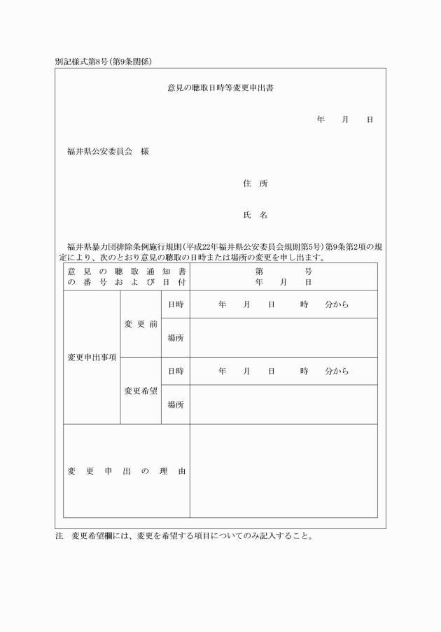 2 当事者は、病気その他やむを得ない理由があるときは、公安委員会に対し、意見の聴取日時等変更申出書(別記様式第8号)により意見の聴取の日時または場所の変更を申し出ることができる。